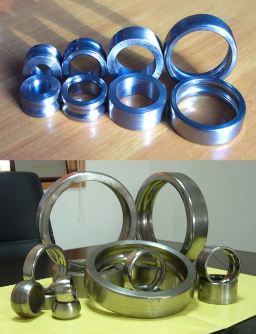 GCr15 軸承鋼含碳量為 1.0%,屬于高碳鋼,塑性差,變形抗力大,難以冷軋環成形。GCr15 軸承鋼室溫冷軋成形是國際高性能軸承環先進制造技術發展方向,我國經過深入研究開發,發明了球軸承環精密冷軋成形方法和滾子軸承環冷軋成形方法,攻克了 GCr15 軸承鋼室溫冷軋高塑性預處理、長壽命軋輥孔型設計制造、精密冷軋環過程控制等關鍵技術,突破了高碳軸承鋼冷軋成形的技術禁區。精密冷軋直接成形軸承滾道,精度為 6~7 級,高出國際先進水平 1~2 級。精密冷軋軸承環,節省了大量切削加工,節材 15%~20%,滾道內部組織細密,金屬流線分布合理,顯著提高軸承壽命。此外,自主研發了新型數控精密冷軋環機,創新性地研究設計了伺服電動機-減速器-強力滾珠絲杠機構,取代液壓伺服系統作為冷軋環機主傳力進給系統,解決了爬行和零飄問題,保持了機電伺服進給系統精密進給優點,實現了 50 t 重載塑性變形條件下的軸承環冷軋精密進給,進給精度達到 0.005 mm,加工精度達到φ 100 mm±0.05 mm,高于德國和日本同類型精密冷軋環機加工精度φ 100 mm±0.1 mm。應用精密冷軋技術和裝備批量生產的軸承環不僅替代進口,還大量出口瑞典 SKF、德國 FAG、日本 NSK、美國 TIMKEN 等國際著名軸承公司,實現了軸承環制造從熱鍛低性能粗坯到冷軋高性能精坯的重大技術突破。精密冷軋成形的典型軸承環如下圖 所示。